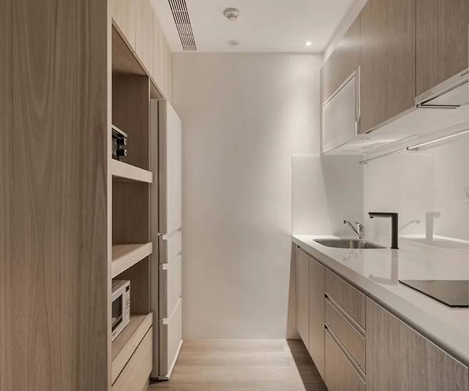 따뜻한 원목 바닥을 밟고 들어서면 직선으로 배치된 주방이 눈길을 사로잡습니다. 채광이 부족한 위치임에도 불구하고 밝고 깔끔한 느낌을 주는 비결은 바로 흰색 강화유리 백스플래시에 있습니다. 기존 타일 대신 선택된 이 소재는 공간 전체를 더욱 밝게 만듭니다.