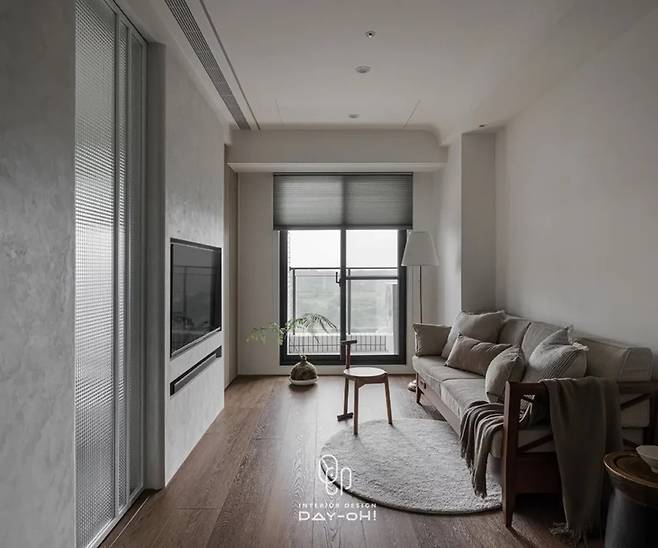 격자무늬 유리를 통해 스며드는 빛이 벽면의 질감과 만나 구름이 피어오르는 듯한 몽환적인 분위기를 연출합니다. TV 벽면의 사선 컷팅은 벽면의 마무리를 알리는 동시에, 매립형 TV 설치를 위해 살짝 돌출된 벽체 두께를 활용한 벽감 수납공간을 만들어냈습니다.