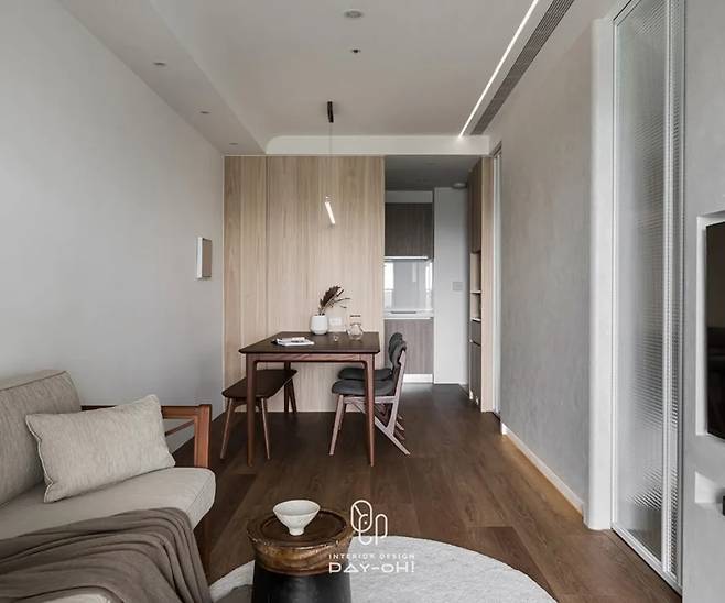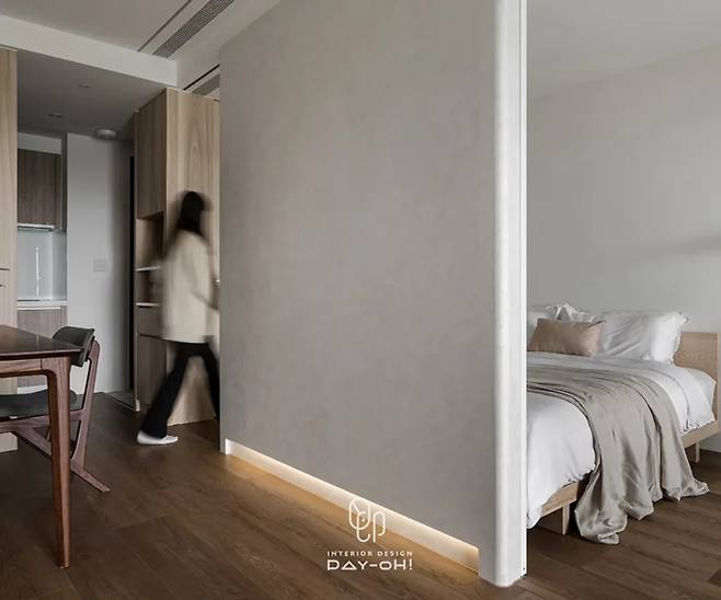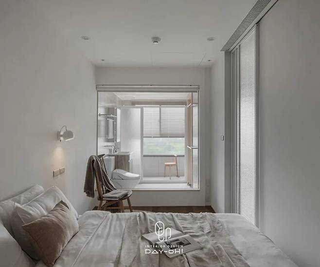 두 개의 슬라이딩 도어가 부부의 서로 다른 생활 리듬을 배려합니다. 침대 양쪽으로 충분한 여유 공간을 확보하면서도 수면의 프라이버시는 보장하고, 고정 벽의 압박감을 해소했습니다. 한쪽 벽면의 바닥부터 천장까지 이어지는 원목 옷장이 자연스러운 분위기를 연출하며, 창가로 들어오는 빛과 조화를 이룹니다.