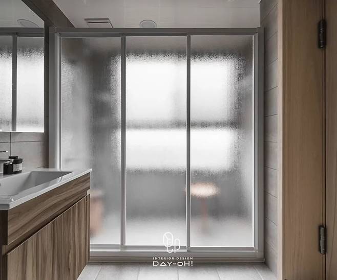 목재 격자 패널 뒤로 완전히 숨겨진 화장실 입구는 기능적 공간을 시각적으로 차단합니다. 내부에는 새롭게 설치된 샤워 도어로 건습 분리가 이루어졌는데, 유리가 아닌 불투명 소재의 가로형 슬라이딩 도어를 선택해 안전성과 프라이버시를 동시에 확보했습니다. 도어를 한쪽으로 완전히 밀어두면 세면용품들을 적절히 가려 깔끔한 시야를 유지할 수 있습니다.