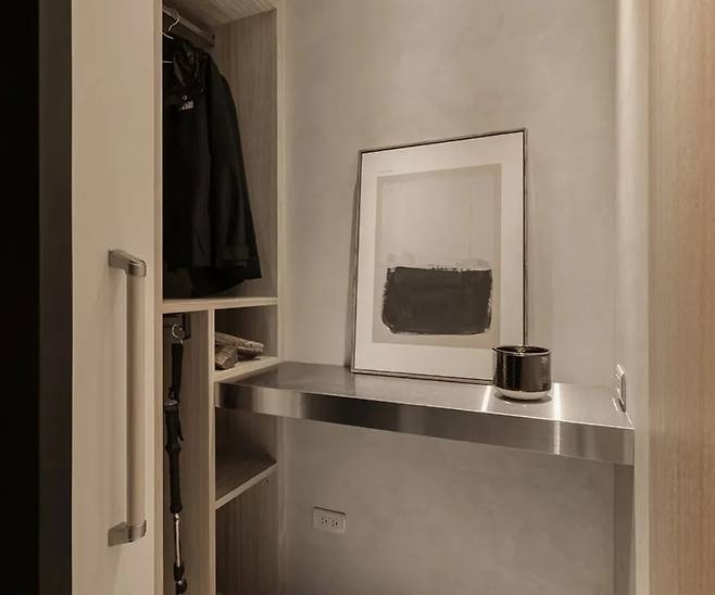 문 옆의 좁은 공간을 활용한 수납장은 일반적인 용도로는 부적합할 수 있지만, 외부로 꺼낼 수 있는 행거와 하단의 등산 장비 전용 칸막이를 통해 완벽하게 활용되고 있습니다. 스테인리스 스틸 플랫폼이 벽을 따라 설치되어 있어 무거운 배낭을 쉽게 내려놓을 수 있으며, 벽면에는 신발을 신는 것을 도와주는 손잡이도 설치되어 있습니다.