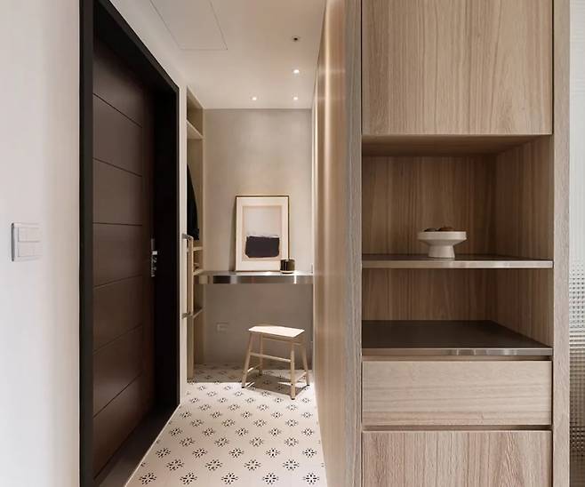 12평의 제한을 넘어서는 공간 활용의 마법이 이곳에서 시작됩니다. 석문 지역에 자리 잡은 이 작은 집은 등산을 즐기는 은퇴 부부를 위한 이상적인 휴식처입니다. 현관에 들어서면 가장 먼저 눈에 띄는 것은 화려한 꽃무늬 타일로 마감된 바닥입니다. 이곳은 단순한 신발장이 아니라 등산 장비를 위한 전용 공간으로 설계되었습니다.