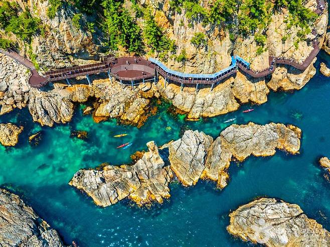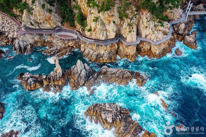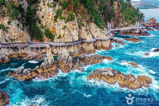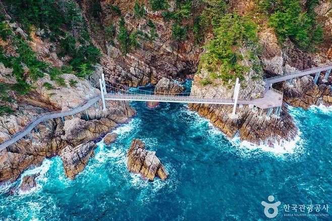 이곳의 중심은 바다 위로 우뚝 솟은 촛대바위입니다. 파란 바다와 어우러진 그 모습은 이름처럼 기이하면서도 아름답습니다. 이 바위 주변을 따라 조성된 총연장 660m의 탐방로는 데크길(512m)과 출렁다리(56m)로 이어지며, 바위 절경을 바로 옆에서 감상할 수 있도록 설계되어 있어요.