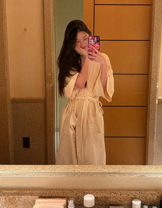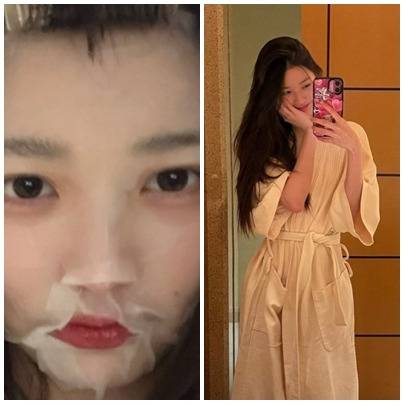 얼굴에 팩을 붙이고 소녀 같은 모습을 보인 장원영은 또 다른 사진에서 민낯에 가운을 입은 모습으로 소탈한 매력을 뽐냈어요.