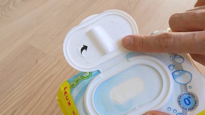 다음으로 물티슈를 보관할 땐 뚜껑이 위로 가게끔 두지 마세요. 사진과 같이 거꾸로 두면 물이 아래로 내려가 사용할 때 항상 촉촉하게 쓸 수 있습니다.