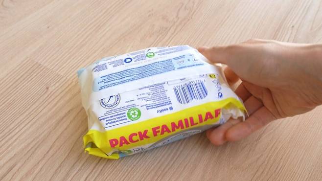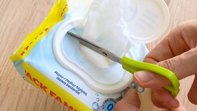 다른 방법으론 가위로 입구 양 옆을 조금씩 잘라 보세요. 그러면 물티슈를 뽑을 때 마찰력이 생겨 여러 장이 나오지 않고 항상 한 장씩 뽑을 수 있을 거예요.