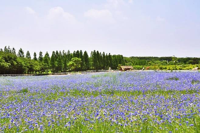 5월이면 아그로랜드는 푸른 꽃물결로 변한다. 목장 초지 일대에 펼쳐진 수레국화가 바람을 따라 한들거리며 몽환적인 풍경을 만들어낸다.