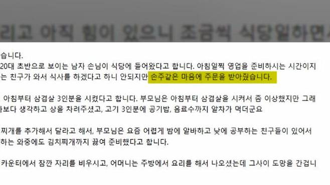 70대 노부부인 식당 주인은 오전 9시라 영업시간 전이었지만 손주 같은 마음에 주문을 받아줬다고 하는데요.