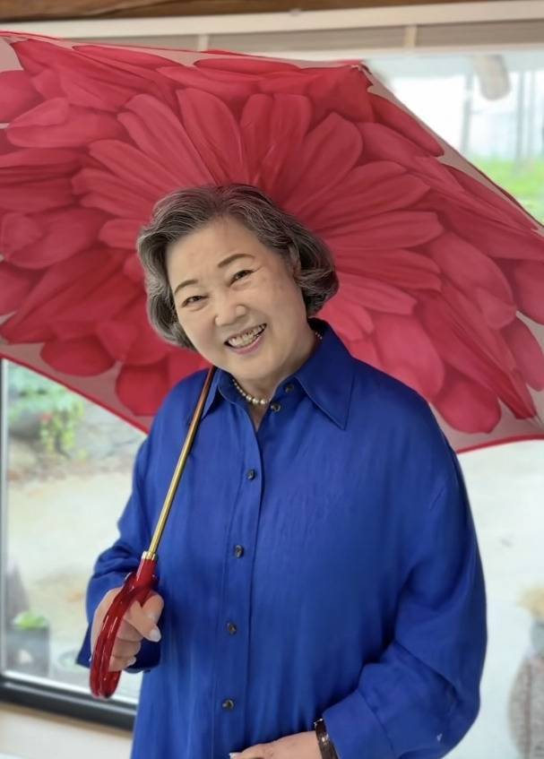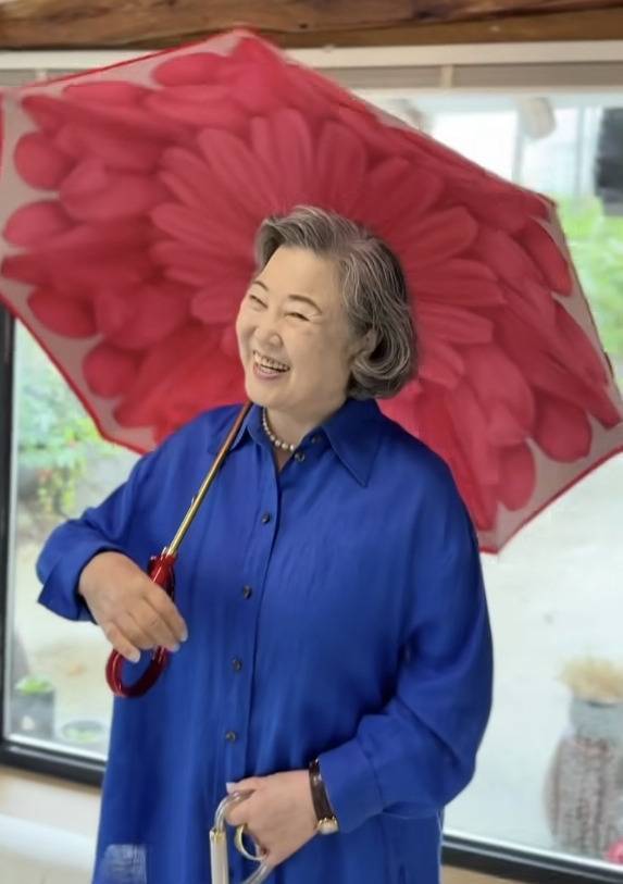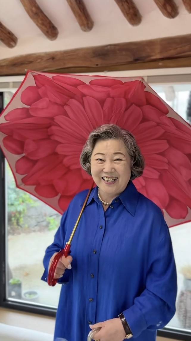 반면 최은경의 어머니는 넉넉한 핏의 블루 셔츠를 착용하고, 강렬한 붉은색이 시선을 사로잡는 양산을 함께 들어 화려하고 우아한 자태를 연출했습니다.