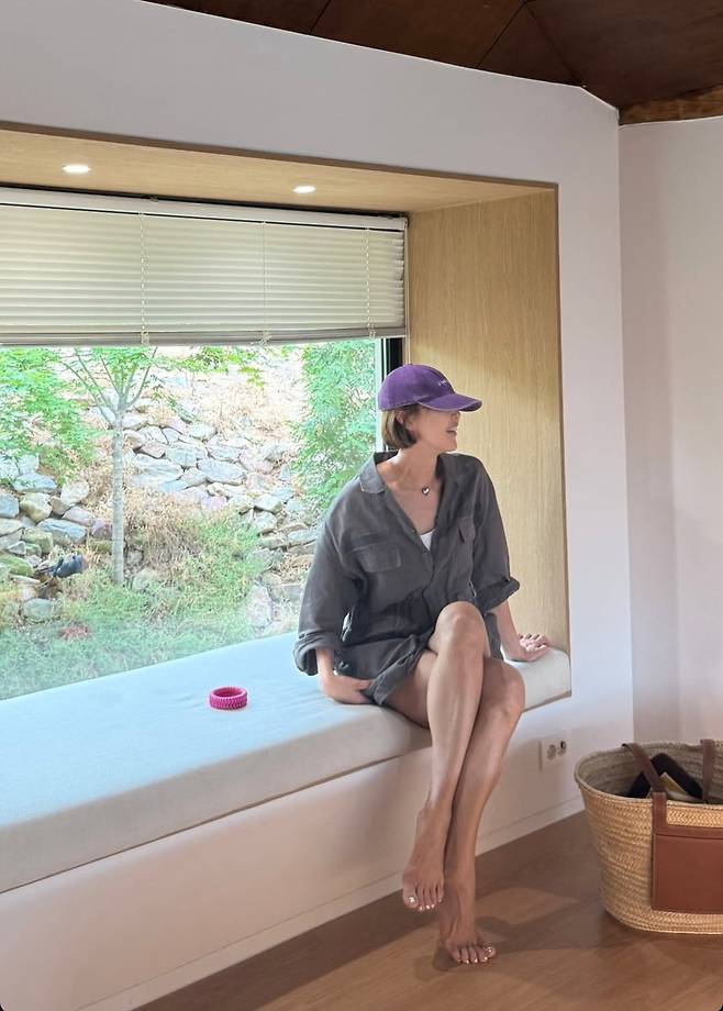 또 다른 컷에서는 퍼플 볼캡에 벨티드 점프슈트를 입고 창가에 앉아 여유를 즐기는 모습이 포착됐습니다.