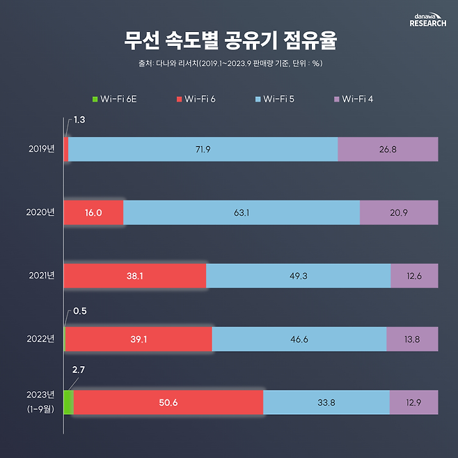 다나와 리서치에 따르면 와이파이 6 공유기는 2021년을 기준으로 대약진했고, 2023년에는 결국 50.6%로 시장 점유율의 절반을 차지했다.