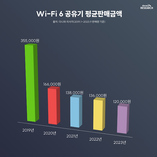 와이파이 6 공유기 평균 판매 금액은 조금씩 내려가고 있다. 초반에는(2019년) 와이파이 6 공유기가 하이엔드 제품군 위주로 있기에 평균 판매 금액이 상당히 높았지만, 점차 메인스트림급 와이파이 6 공유기들이 등장하며 평균 판매 금액이 줄어들기 시작했다.