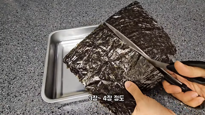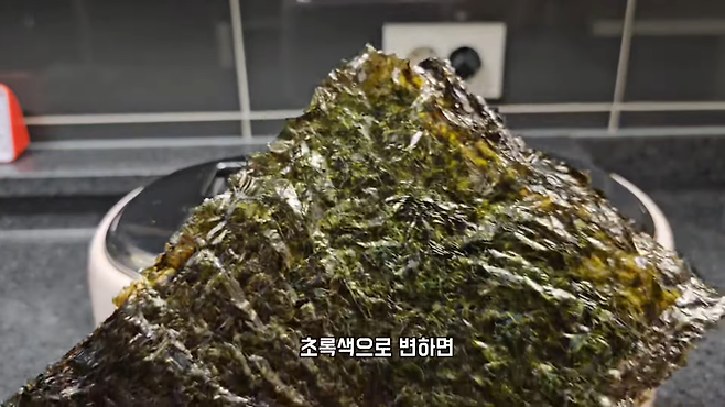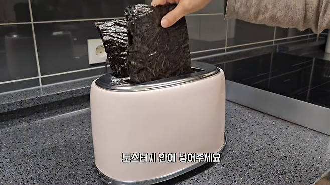 첫 번째는 김구이입니다. 집에 있는 생김, 저는 곱창김을 좋아하는데요. 3장 -4장 정도 한번에 구울 수 있어요. 김을 반으로 잘라준 뒤 토스터기 안에 넣어 주세요. 김은 금방 타기 때문에 바로 옆에서 지켜보면서 타이밍을 잘 보셔야 해요. 집게로 살짝 들어서 확인하면서 20초 정도만 구워준 뒤 초록색으로 변하면 토스터기를 끄고 꺼내주세요.