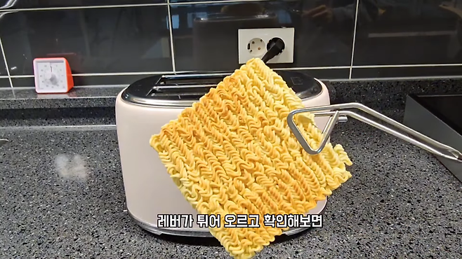 세 번째는 추억의 간식 라면땅입니다. 생라면은 토스터기 안에 맞춤처럼 딱 1개가 쏙 들어가요. 레버를 눌러 구워주세요. 레버가 튀어 오르고 확인해보면 이렇게 갈색으로 잘 구워진답니다. 지퍼팩에 라면을 넣고 설탕 약간 스프를 뿌려서 흔들어 주면 되는데요. 토스터기로 라면땅도 정말 간단하게 완성돼요.