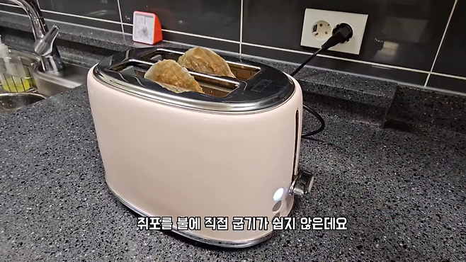 토스터기 안에 쥐포를 넣고 레버를 눌러준 뒤 레버가 튀어 오를 때까지 기다려 주세요. 조금 덜 구워졌다면 다시 작동시켜서 기호에 맞는 상태로 구워드시면 됩니다. 직화구이처럼 정말 잘 구워져서 저녁에 가볍게 맥주 안주로 드시기 좋아요.