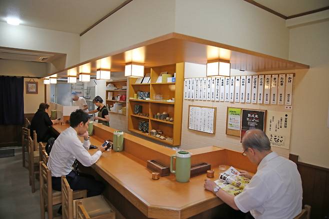 가족이 운영하는 작은 우동집. 눈앞에서 밀가루를 반죽해 면을 뽑고 국물을 끓이고 튀김을 튀겨 내는 모습이 정감 넘친다. 메뉴는 기본 우동인 카케 우동에 새우 튀김, 고기, 우엉 튀김 등 원하는 토핑을 주문하면 된다. 메뉴가 적힌 나무판을 쭉 걸어두고 재료가 떨어진 것은 판을 뒤집는데 가장 먼저 동이 나는 건 언제나 새우튀김이다. 인기 많은 집이라 항상 줄이 긴데, 당일 만든 재료가 다 떨어지면 문을 닫는다.