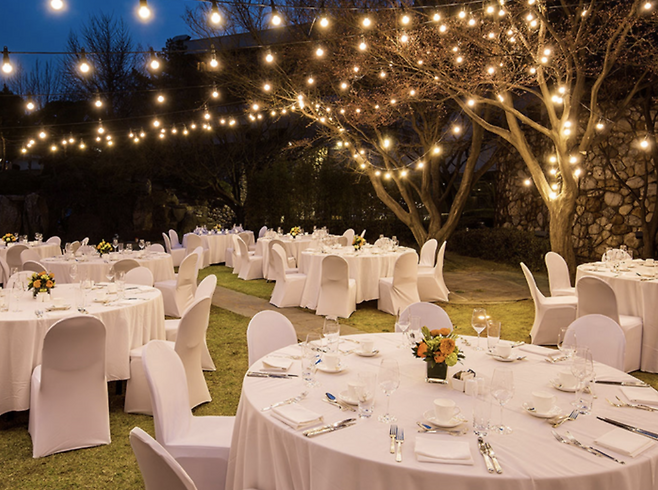 한강을 바로 보이는 탁 트인 전망과 인챈티드 포레스트, 라벤더 가든, 로열 펠리스, 체리 블로섬 등 다채로운 콘셉트로 가득한 로맨틱한 야외 웨딩홀 그랜드 하얏트 풀사이드 가든.