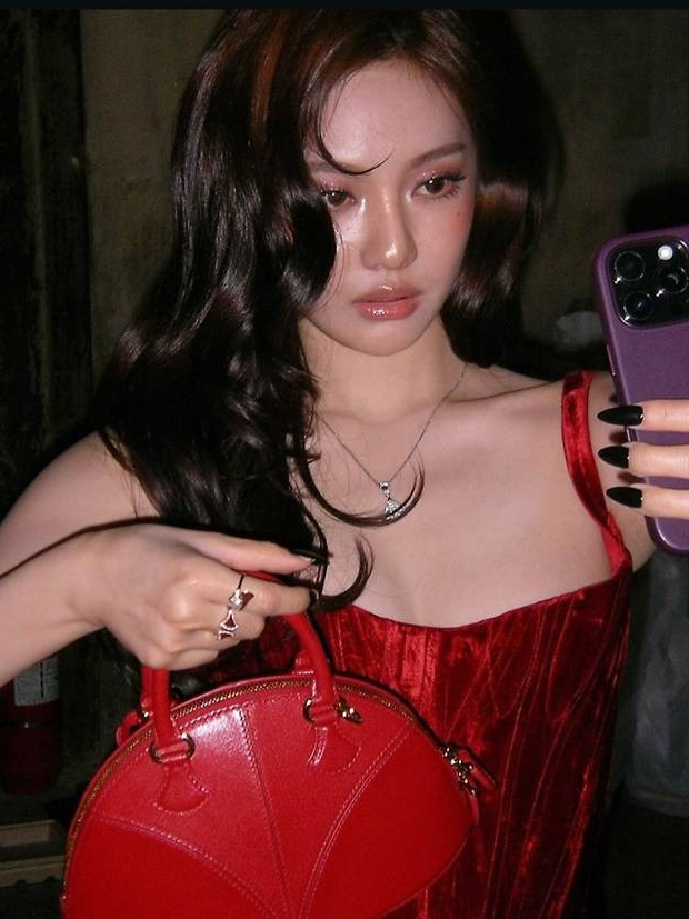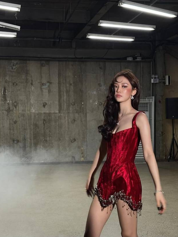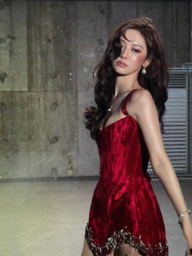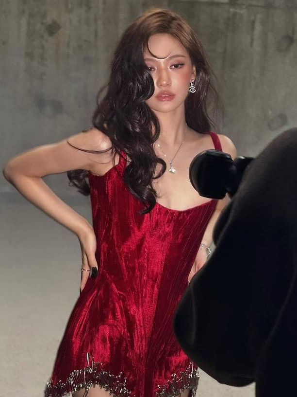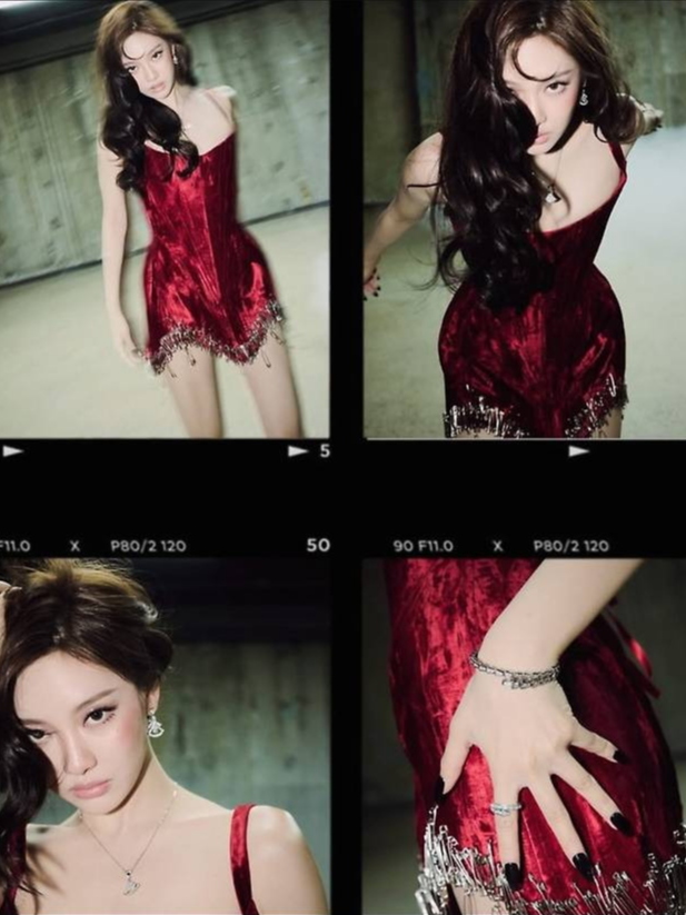 깊은 레드 컬러의 벨벳 미니드레스를 완벽히 소화하며, 실루엣을 따라 흐르는 텍스처와 깊게 파인 넥라인이 그녀 특유의 매력을 극대화했습니다.