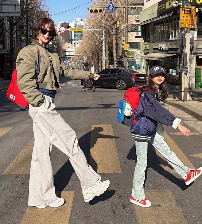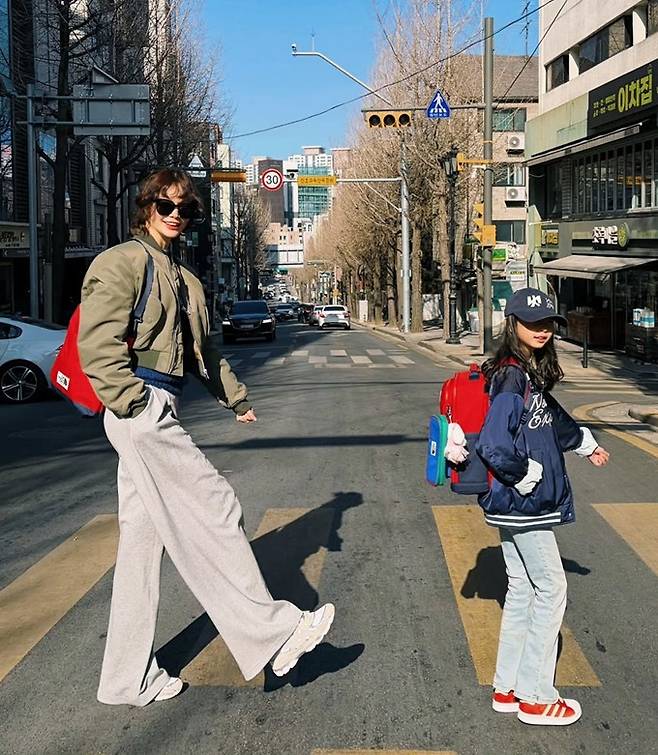 공개한 사진에서 송경아는 조거팬츠에 카키 블루종 집업 점퍼를, 딸 9살 딸 도해이는 데님 팬츠에 트랙 집업 재킷을 매치해 닮은꼴 스타일의 모녀 커플룩을 완성했다.