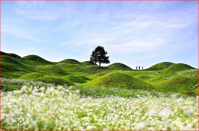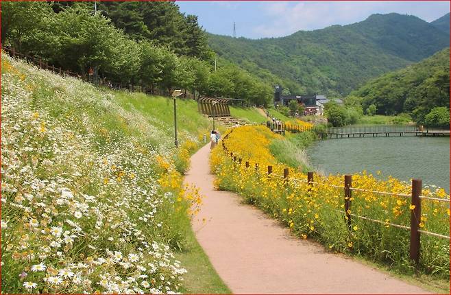 강렬한 노란색으로 햇살을 닮은 금계국은 언덕 경사로, 데크길 근처를 따라 흐드러지게 피어 초여름의 활력을 가득 안겨줍니다. 데이지와 어우러진 금계국 풍경은 사진 찍기에도 딱 좋죠.