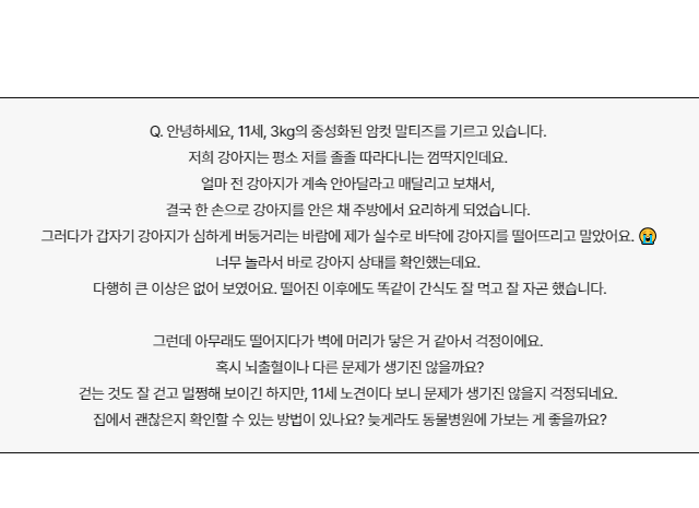 무엇보다 중요한 건 낙상으로 강아지의 정신 상태가 안 좋아 보인다면, 보호자분이 집에서 무얼 해주려고 하기보다는 곧바로 동물병원에 가서 즉각적인 처치를 꼭 받으셔야 합니다.