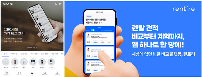 렌트리는 생활가전 렌털 가격 비교 플랫폼이다. 웹이나 앱에 원하는 렌털 조건을 입력하면 제품 정보와 실시간 유통 데이터를 기반으로 최적의 제품을 추천해 준다. 전국 판매자들의 견적을 취합해 이용자에게 보여주는 ‘역경매 방식’으로 쉽게 견적을 비교할 수 있다. 안전 거래를 담보하기 위해 입점 판매원을 까다롭게 관리한다. 플랫폼 내에서 편하게 채팅 상담을 할 수 있다.