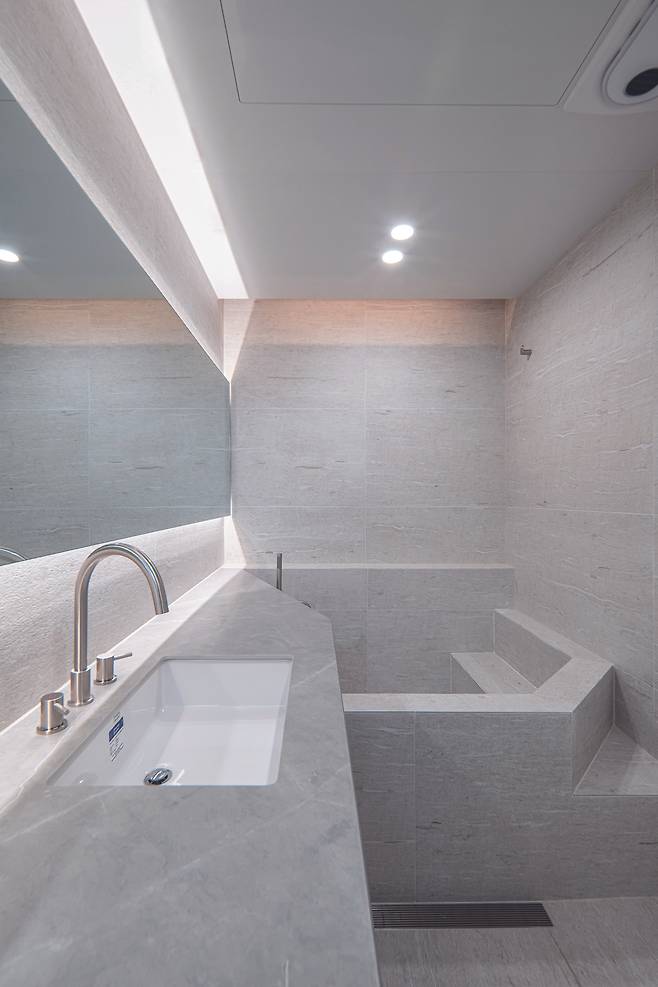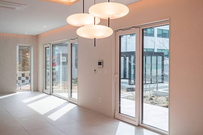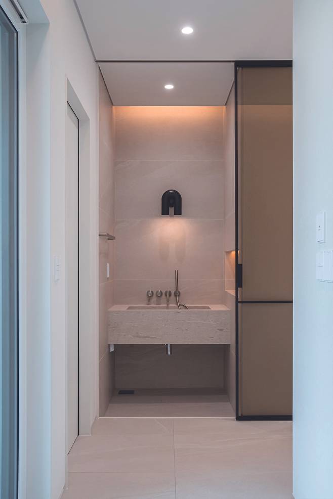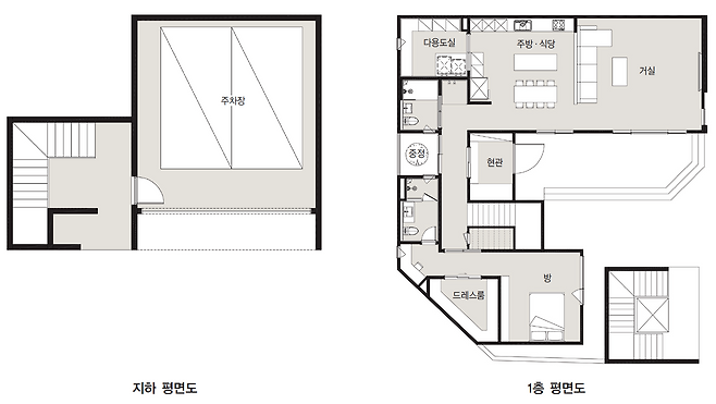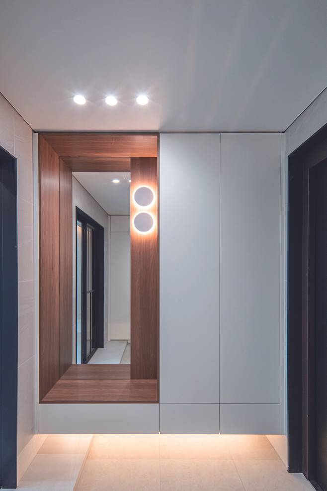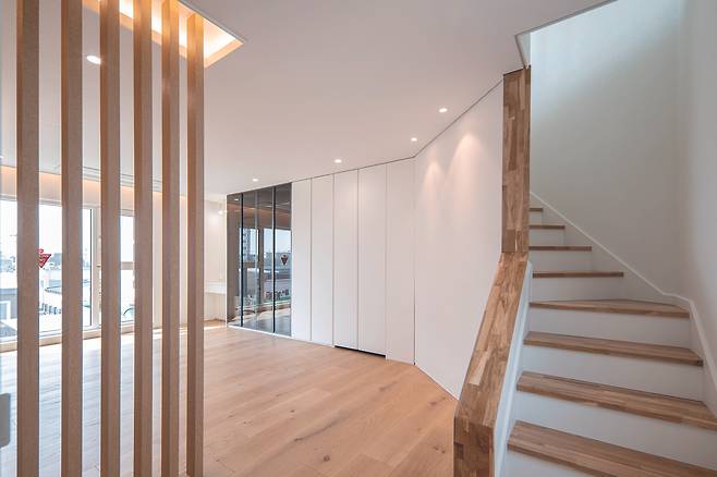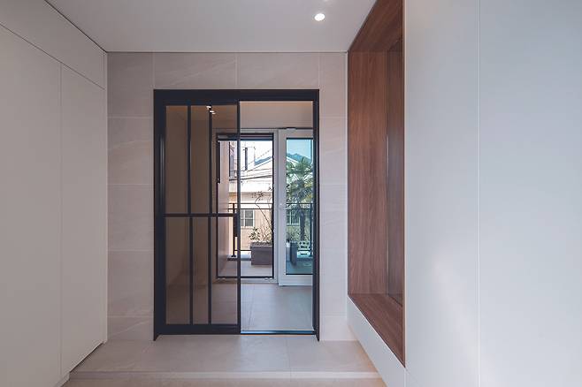 실내의 첫인상인 1층 현관은 양쪽에 수납장과 신발장을 각각 마련하고 신발을 신고 벗는 동안 앉을 수 있는 매립형 벤치를 마련해 실용적이면서 감각적인 분위기로 완성했다. 진입 후 바로 앞에서 복도를 마주하지만 작은 중정을 계획해 시야의 답답함을 덜어낸 센스가 돋보인다.
