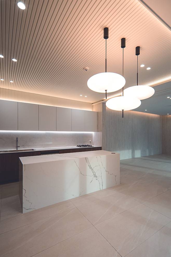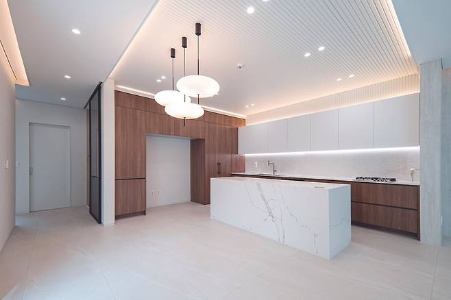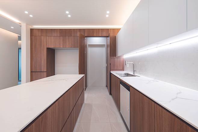 현관으로 들어와 오른쪽에는 주방과 식당 그리고 거실까지 일자로 길게 뻗은 공적 공간이 펼쳐진다. 벽으로 막히는 곳 없이 큰 창을 통해 들어오는 채광이 더해져 더욱 확장감이 느껴진다. 자주 요리하시는 부모님을 고려해 주방 벽면은 유광의 박판 타일을 적용했고 아일랜드 조리대에도 동일한 자재로 통일감을 줬다. 천장에 ‘ㄱ’자 형태로 디자인한 템바보드는 거실과는 자연스럽게 영역을 분리하면서 시선 흐름은 부드럽게 처리한다. 거실은 몰딩을 최소화해 전체적인 분위기는 그대로 이어가며 간결함을 더욱 살렸다.