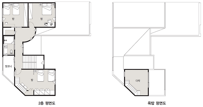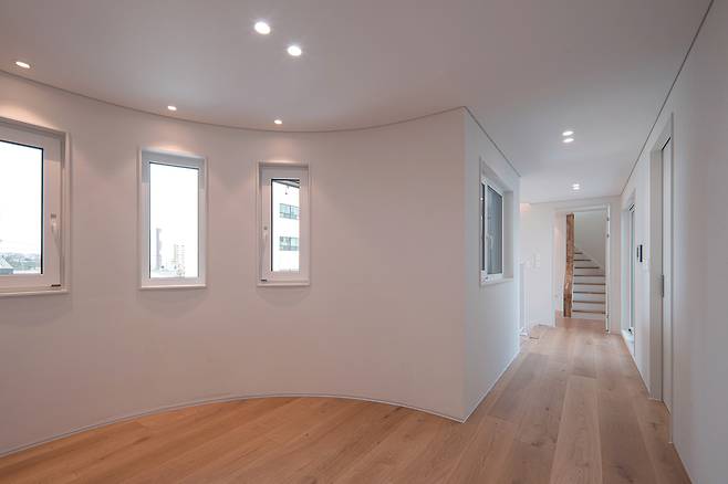 2층은 건축주인 박서진과 형제들이 사용할 침실 3곳으로 구성된다. 집이 전체적으로 큰 볼륨을 가지다 보니 직선적인 요소가 비교적 많이 사용됐는데 2층 복도 한쪽을 곡선으로 처리함으로써 단조로움을 피했다. 어떤 소품이나 가구를 두느냐에 따라 층의 분위기가 바뀔 수 있는 허브 공간이다.