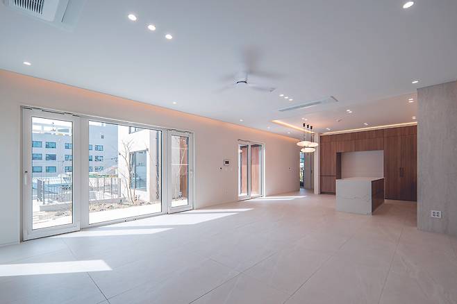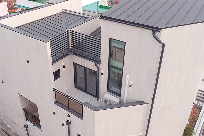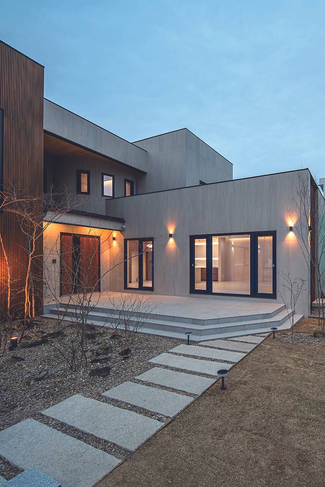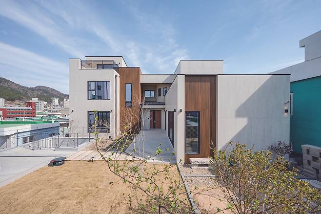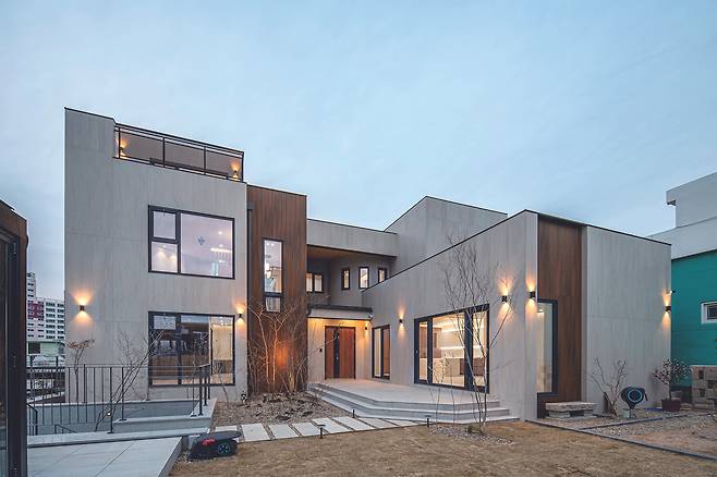 가장 먼저 올려다봐도 끝이 없는 규모가 시선을 사로잡는다. 대저택이라는 표현에 어울리게 모든 공간을 넉넉하게 설계한 것이 특징이다. 안으로 진입하면 너른 마당이 펼쳐지고 이를 ‘ㄱ’자 형태로 집이 감싸고 있다. 수치적으로는 자칫 부담스러운 규모일 수 있지만 실제로 마주하면 오히려 아늑하다는 인상을 받는다. 아이보리 톤과 우드 톤으로 선정한 외장재의 조합 덕분이다. 특히, 박판 타일과 큼직한 창호 등이 시원시원하면서 세련된 분위기까지 전한다.