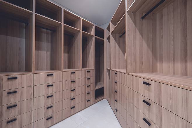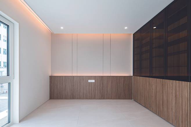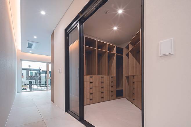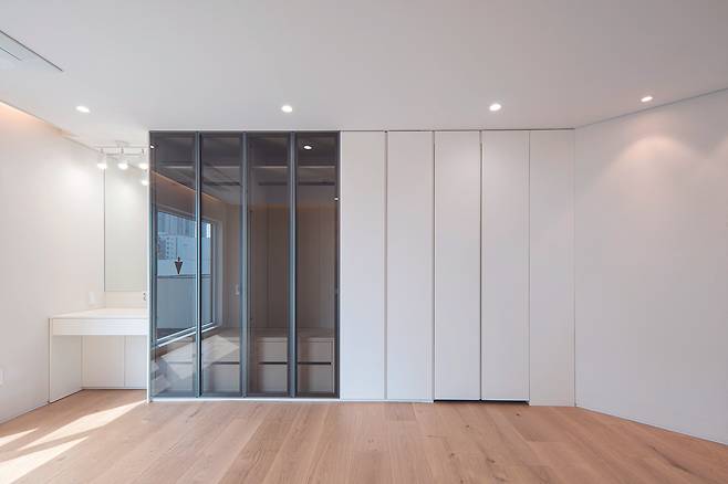 부모님 생활에 맞춰 공적 공간과 가깝게 배치한 1층 침실은 마치 호텔과 같은 고급스러운 분위기로 조성했다. 침대에서 조명을 바로 켜고 끌 수 있는 개별 스위치를 설치하거나 벽면은 패브릭 질감의 특수 벽지를 사용했다. 공간 형태를 고려해 수납장을 맞춤 제작한 드레스룸도 포함한다. 드레스룸에 3연동 도어를 사용하는 등 고급스러운 분위기에 어울리는 디테일을 적용했다.