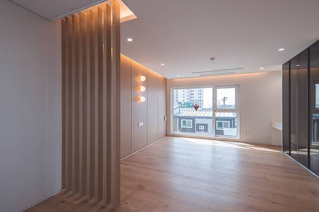 침실 중에서도 특히 건축주의 침실은 내부에 옥탑으로 이어지는 별도의 계단을 계획해 편의성과 공간 활용도를 높인 것이 특징이다. 문을 열면 안쪽이 바로 보이기보다는 갤러리 월을 세워 시선을 완충시켰다. 작은 디테일이지만 프라이빗한 분위기를 연출하는 데 안성맞춤이다. 옥탑의 경우 설비를 모두 갖췄기에 계절 상관없이 공간의 쓰임이 무궁무진하다. 빔프로젝터를 설치하면 영화관, 장비를 두면 작업실로도 활용할 수 있는 건축주만의 포켓 공간이다. 다른 침실 또한 별도의 가구 없이도 정돈된 분위기를 연출할 수 있는 인테리어로 완성했다.