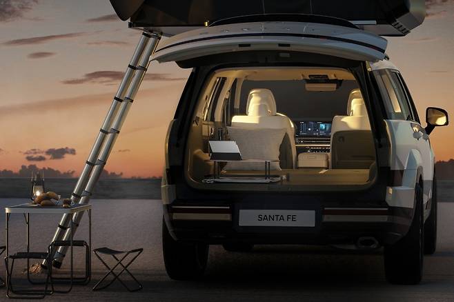 후면부는 테라스 콘셉트의 대형 테일게이트를 중심으로 램프류가 낮게 배치됐다. 방향지시등과 후진등은 범퍼에 탑재됐다. 테일게이트 중앙의 'SANTA FE' 레터링은 크기가 상당하다. 실내는 넉넉한 거주 공간을 바탕으로 브랜드 최신 사양과 다양한 친환경 소재가 적용됐다.