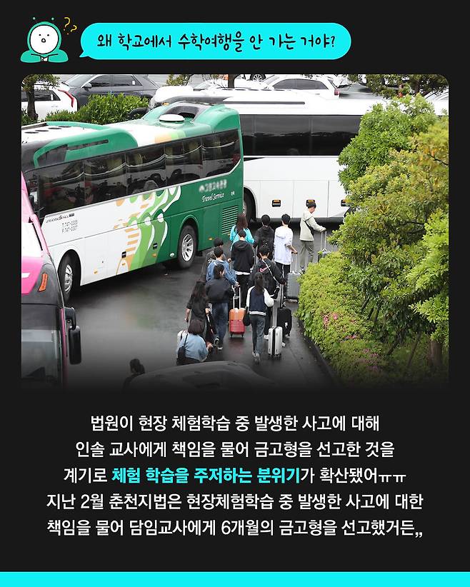 현장 체험학습 중 발생한 사고에 대해 인솔 교사에게 책임을 물어 금고형을 선고한 것을 계기로 교사들 사이에 체험 학습을 주저하는 분위기가 확산됐습니다.