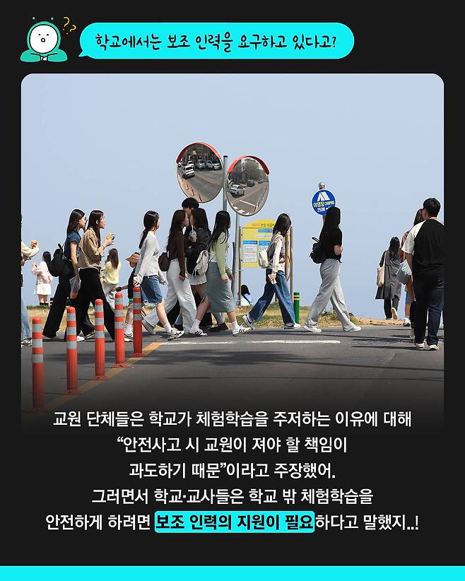 학교·교사들은 학교 밖 체험학습을 안전하게 하려면 보조 인력의 지원이 필요하다고 주장하고 있습니다.