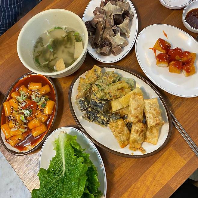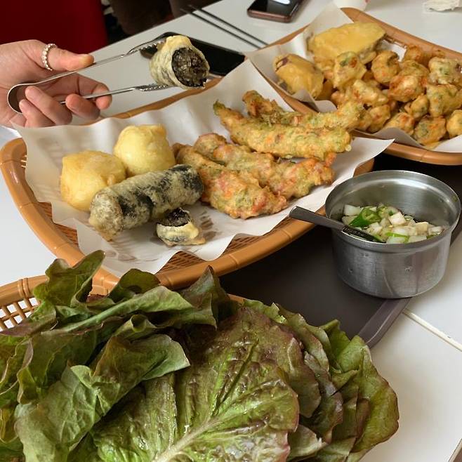 ‘상추튀김’을 검색하면 가장 많이 볼 수 있는 이름 ‘현완단겸’. 오징어, 돼지고기, 고추, 김말이 등 여러 종류의 튀김이 준비되어 있고, 상추튀김 전문점답게 무제한으로 먹을 수 있는 싱싱한 상추가 셀프바에 준비되어 있다. 튀김 한점과 양파 다데기를 올려 한 쌈 싸먹으면 부드러운 상추와 바삭한 튀김의 식감이 어우러져 먹는 재미를 더해준다. 신선한 상추와 다데기의 알싸하고 새콤한 맛이 튀김의 느끼함을 잡아줘서 끊임없이 먹게 된다. 다양한 분식도 준비되어 있으니 취향껏 주문해 본인만의 방식으로 상추튀김을 즐겨봐도 좋을 것.