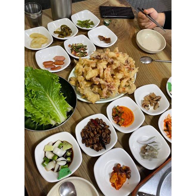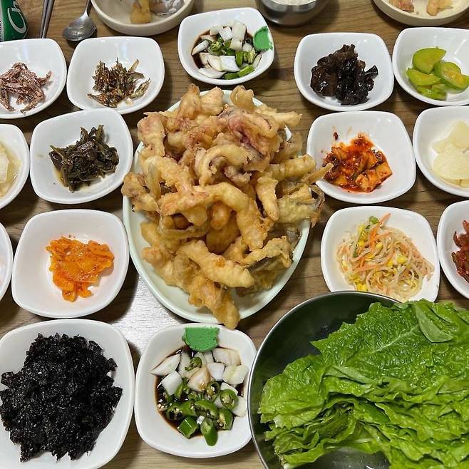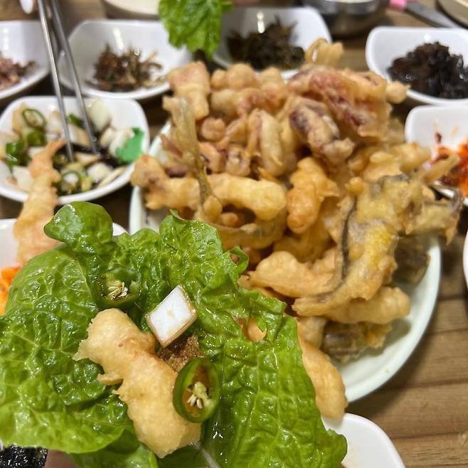 상추튀김은 튀김의 맛이 맛집 여부를 결정짓는 가장 중요한 요소이다. 이번에 소개할 집은 튀김으로는 이미 정평이 나있는 곳으로, 생소한 황실이(황강달이 혹은 황새기로도 불린다) 튀김을 만나볼 수 있는 곳이다. 모둠튀김을 주문하면 광주의 여타 상추튀김 맛집보다 두툼한 오징어튀김, 야들야들한 새우튀김, 통째로 튀겨냈지만 비리지 않고 부드러운 황실이 튀김을 상추와 함께 내어준다. 또 다른 이곳의 매력 포인트는 백반집 부럽지 않게 반찬이 무려 12가지가 함께 나온다는 것. 바삭한 치킨과 시원한 동태찌개 또한 인기 메뉴 중 하나로 한번 방문하는 것으로는 부족할지도 모른다.