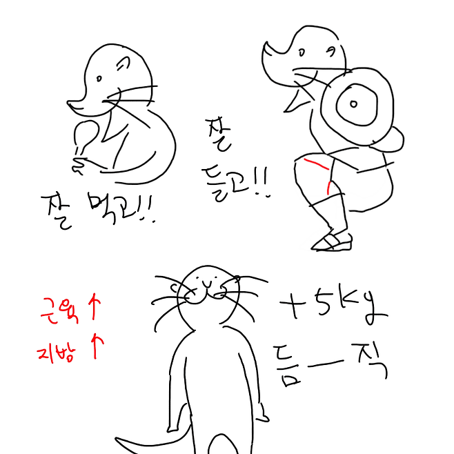 운동강도 높임 + 적당한 식단으로 유지(1~2kg증량 예상)