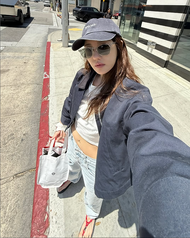 첫 번째 사진 속 이지아는 데님 팬츠와 크롭 티셔츠 위에 네이비 컬러의 루즈한 재킷을 걸쳐 스트리트 감성 가득한 스타일링을 선보였습니다. 챙 있는 볼캡과 무심한 듯 자연스럽게 흐르는 긴머리, 선글라스까지 더해져, 마치 헐리우드 배우 같은 분위기를 자아냈습니다. 특히 배를 살짝 드러낸 크롭 티셔츠는 그녀의 슬림한 몸매를 더욱 돋보이게 만들어줬습니다.