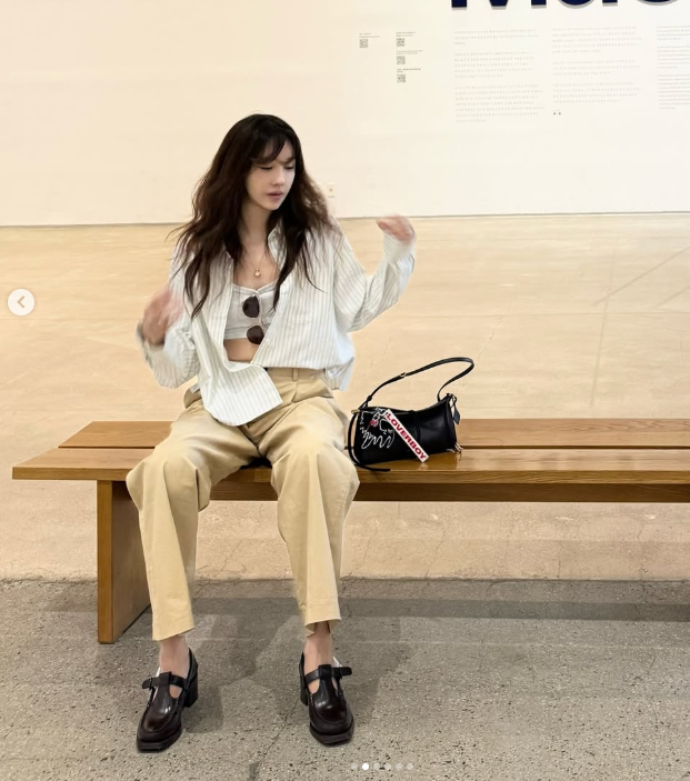 두 번째 룩은 스트라이프 셔츠를 가볍게 걸치고 베이지 슬랙스를 매치한 갤러리 방문 패션. 오픈 셔츠 사이로 비치는 크롭탑은 그녀만의 센스와 자신감을 보여주며, 블랙 로퍼와 스트랩 장식 가방이 룩의 균형을 맞춰 무심한 듯 시크한 포즈와 표정은 이지아만의 아우라를 완성했습니다.