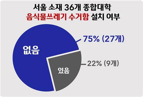 서울시 소재의 종합대학 36개를 대상으로 음식물 쓰레기통 설치 여부를 조사한 결과, 캠퍼스 내 음식물쓰레기 수거함이 없는 대학이 75%(27개)에 달했다.
