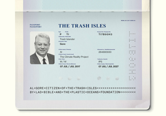 2017년 광고제작자 마이클 휴와 달 데반스 드 알메이다는 획기적이고 혁신적인 방법으로 환경 운동 캠페인을 벌입니다. UN에 GPGP를 국가로 인정해 달라는 신청서를 제출한 것인데요. 이들은 국명을 ‘쓰레기 섬’이라는 뜻의 ‘Trash Isle’로 정했고요.