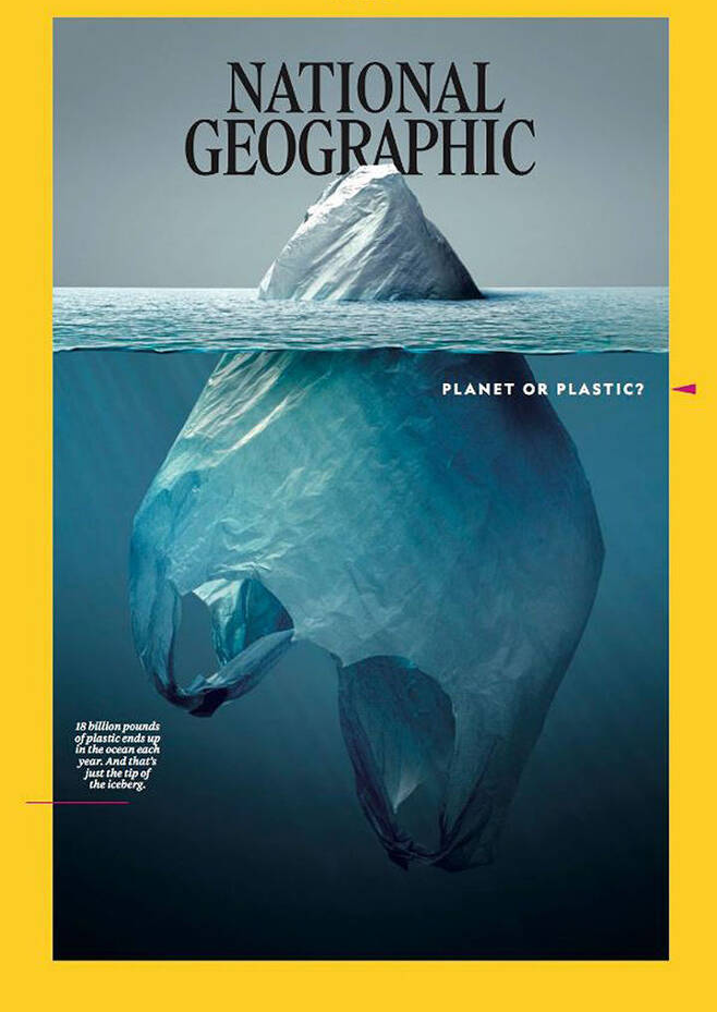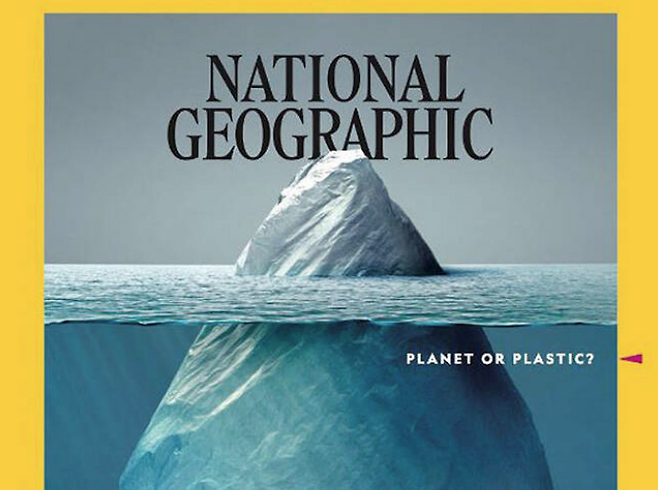 표지에는 "지구냐, 플라스틱이냐(PLANET OR PLASTIC?"라는 문구와 함께 "매년 180억 파운드의 플라스틱이 바다로 흘러 들어간다. 그리고 그것은 빙산의 일각일 뿐"이라고 적혀있습니다. 이 사진은 언뜻 빙산처럼 보이지만, 사실 사진 속 빙산처럼 보이는 부분은 물속에 떠다니는 비닐봉지 쓰레기의 끝부분입니다.
