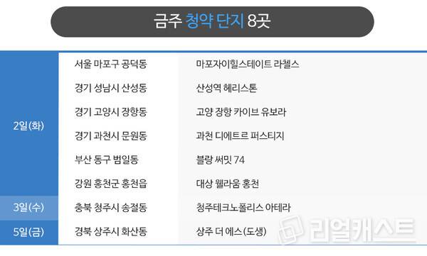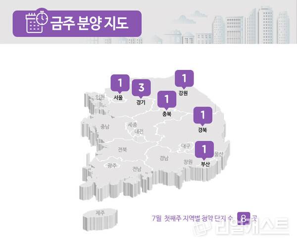부동산인포에 따르면 7월 1주 전국에서 신규 청약 및 입주자를 모집하는 곳은 8곳, 총 1만24가구로 집계됐습니다(총 가구수 기준).