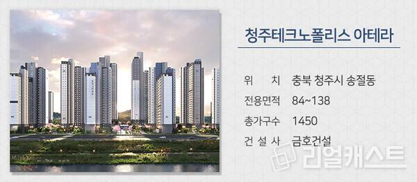 금호건설이 충북 청주시 송절동에서 ‘청주테크노폴리스 아테라’를 분양합니다. SK하이닉스, LG생활건강 등 대기업 업무시설이 가까운 직주근접 단지입니다. 고층부에는 스카이라운지가 조성되며 수영장, 다목적 체육관 등 다양한 주민편의시설도 마련될 예정입니다.