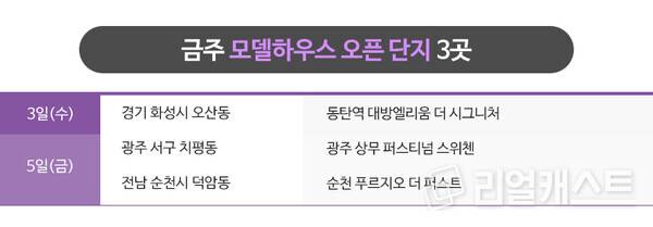 금주 모델하우스는 수도권 1곳, 지방 2곳 등 총 3곳이 오픈 될 예정입니다.