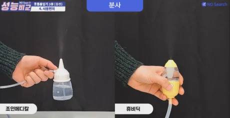 조인메디칼은 분사통의 구멍을 막으면 통 안의 액체를 분사하는 방식이고, 휴비딕은 분사 스위치를 누르면 분사하는 방식입니다.