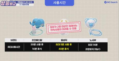 사용시간은 조인메디칼이 30분 사용 후 10분 휴식, 휴비딕이 최대 5분 사용 후 40분 휴식, 노시부가 최대 14분 사용 가능했습니다.
