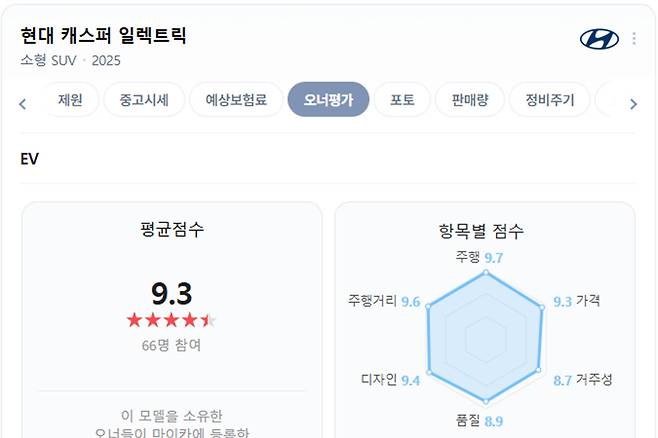 실제 차주들의 평가를 기반으로 차량 만족도 점수를 공개하는 ‘네이버 마이카 오너평가’에 다르면 현대차 캐스퍼 일렉트릭의 오너평가 점수는 9.3점이다.