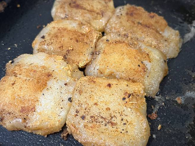 약한 불로 유지하고, 바닥면이 살짝 노릇해지면 얼른 뒤집어 주세요. 팬에 데워도 너무 오랜 시간 열을 가하면 떡이 퍼질 수 있기 때문에 유의해야 합니다.